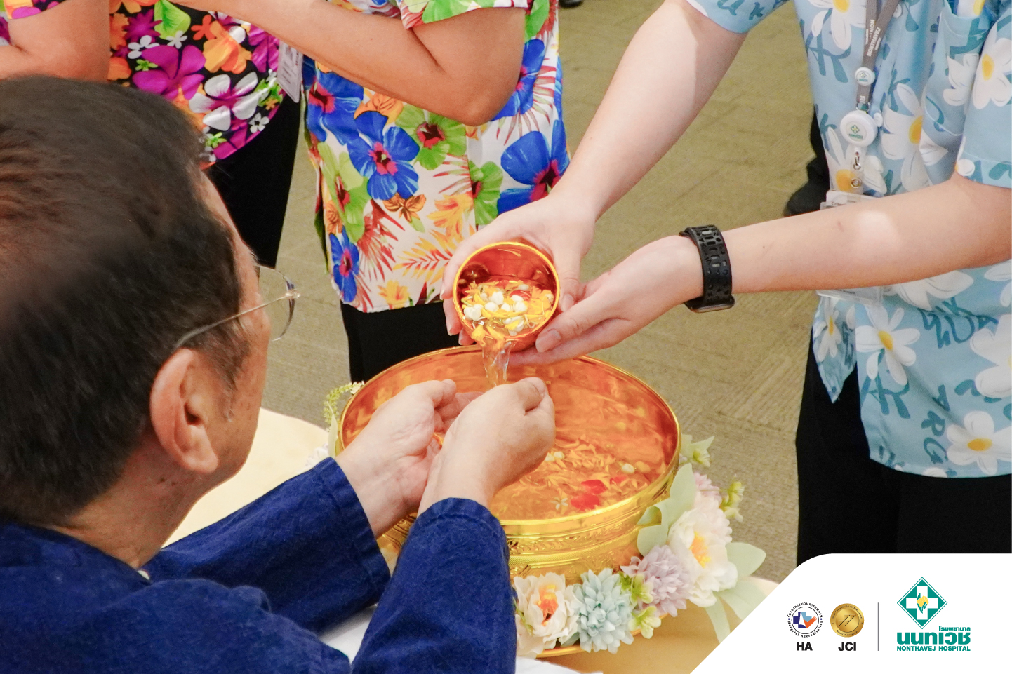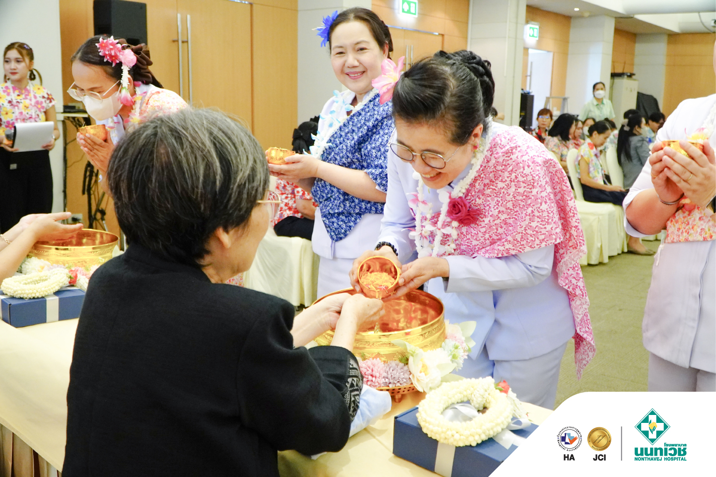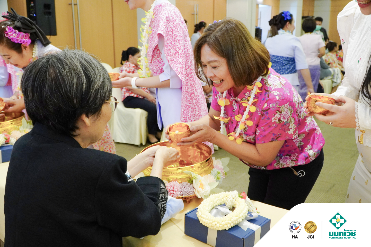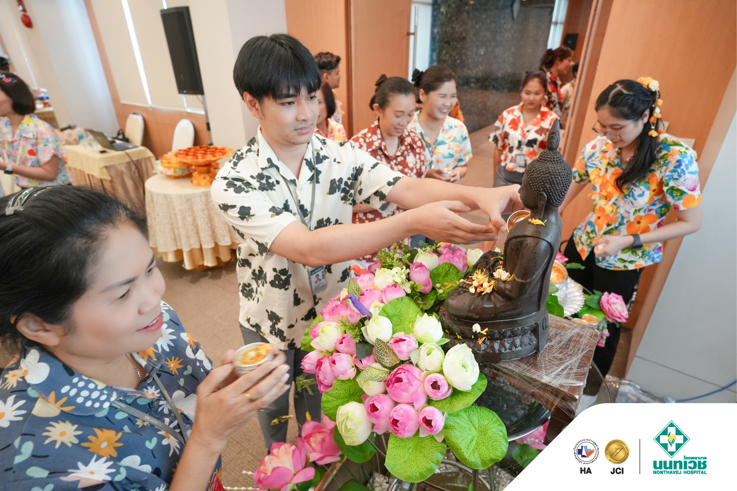 ภายในงานมีพิธีสรงน้ำพระเพื่อความเป็นสิริมงคล พร้อมทั้งรดน้ำขอพรจาก รศ.ดร.กมเลศน์ สันติเวชชกุล ประธานเจ้าหน้าที่บริหาร และคณะผู้บริหารโรงพยาบาลนนทเวช โดยมีแพทย์ พยาบาล และบุคลากรเข้าร่วมอย่างพร้อมเพรียง บรรยากาศเป็นไปอย่างอบอุ่น เต็มไปด้วยรอยยิ้ม สะท้อนถึงความผูกพันในองค์กรและเสน่ห์ของวัฒนธรรมไทย