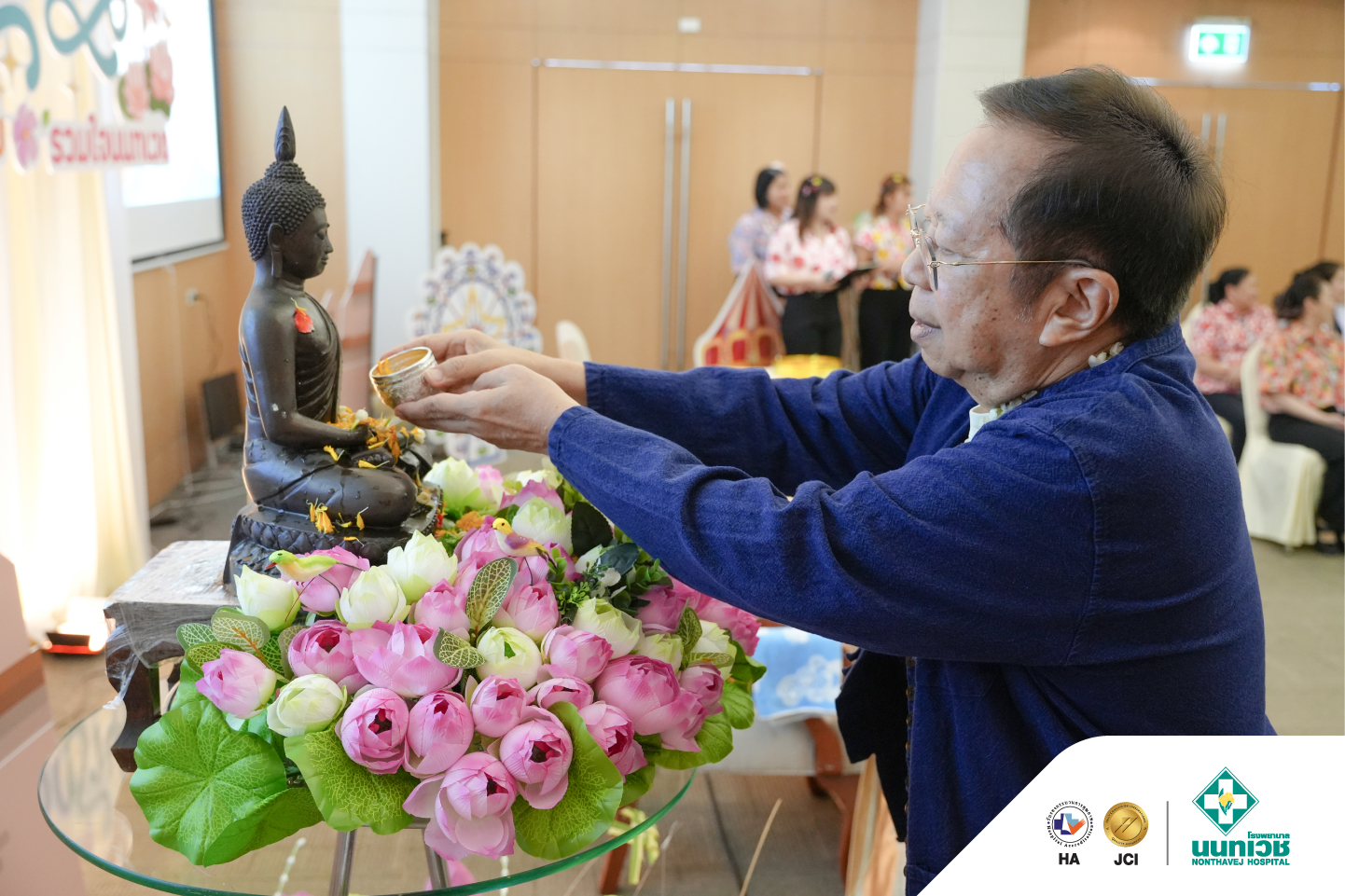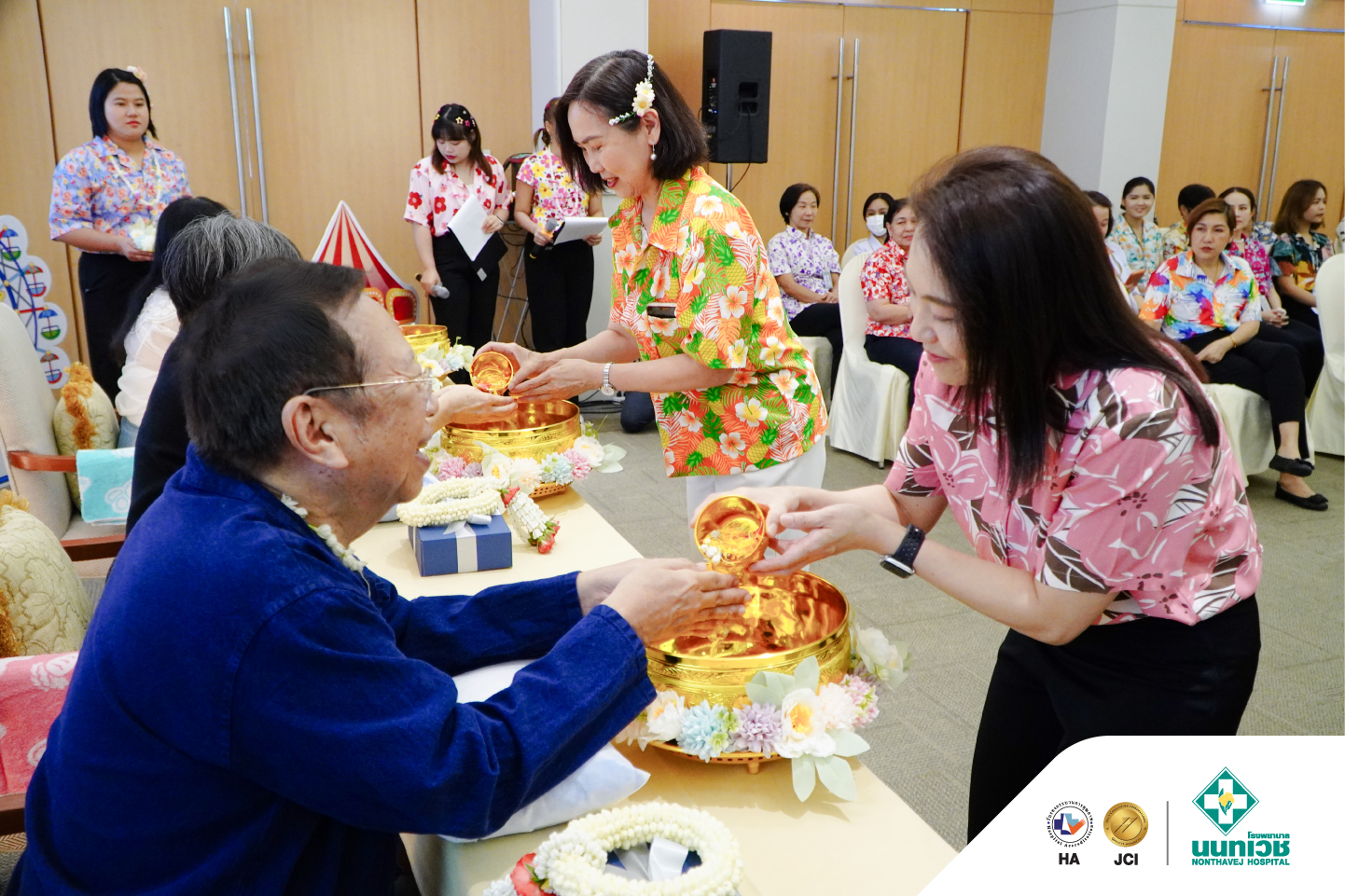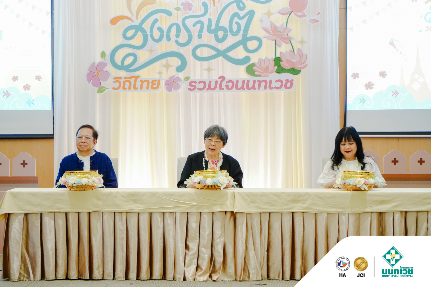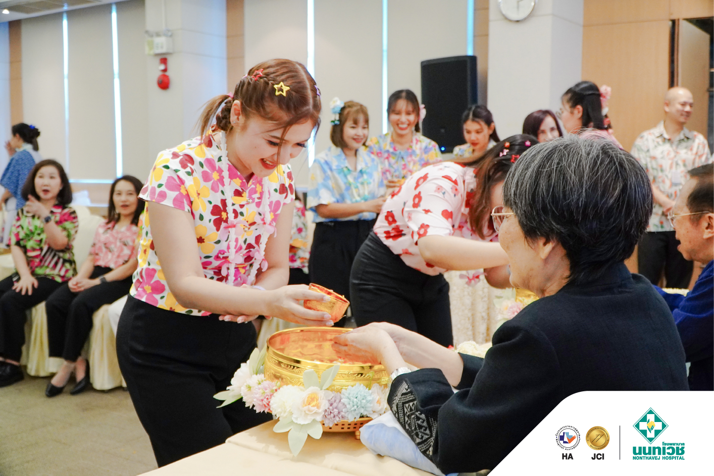 ภายในงานมีพิธีสรงน้ำพระเพื่อความเป็นสิริมงคล พร้อมทั้งรดน้ำขอพรจาก รศ.ดร.กมเลศน์ สันติเวชชกุล ประธานเจ้าหน้าที่บริหาร และคณะผู้บริหารโรงพยาบาลนนทเวช โดยมีแพทย์ พยาบาล และบุคลากรเข้าร่วมอย่างพร้อมเพรียง บรรยากาศเป็นไปอย่างอบอุ่น เต็มไปด้วยรอยยิ้ม สะท้อนถึงความผูกพันในองค์กรและเสน่ห์ของวัฒนธรรมไทย